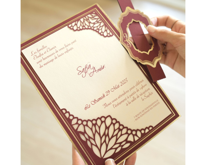Carte d'invitation avec cadre rouge accompagnée d'une enveloppe beige.