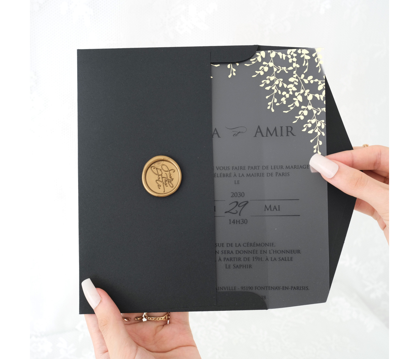 Carte d'invitation élégante accompagnée d'une enveloppe noire.