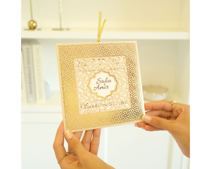 Carte d'invitation se glissant dans une pochette laissant apparaitre les prénoms des mariés au centre.