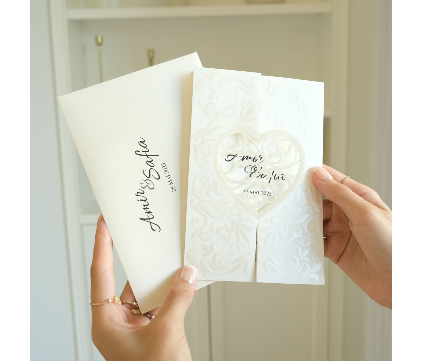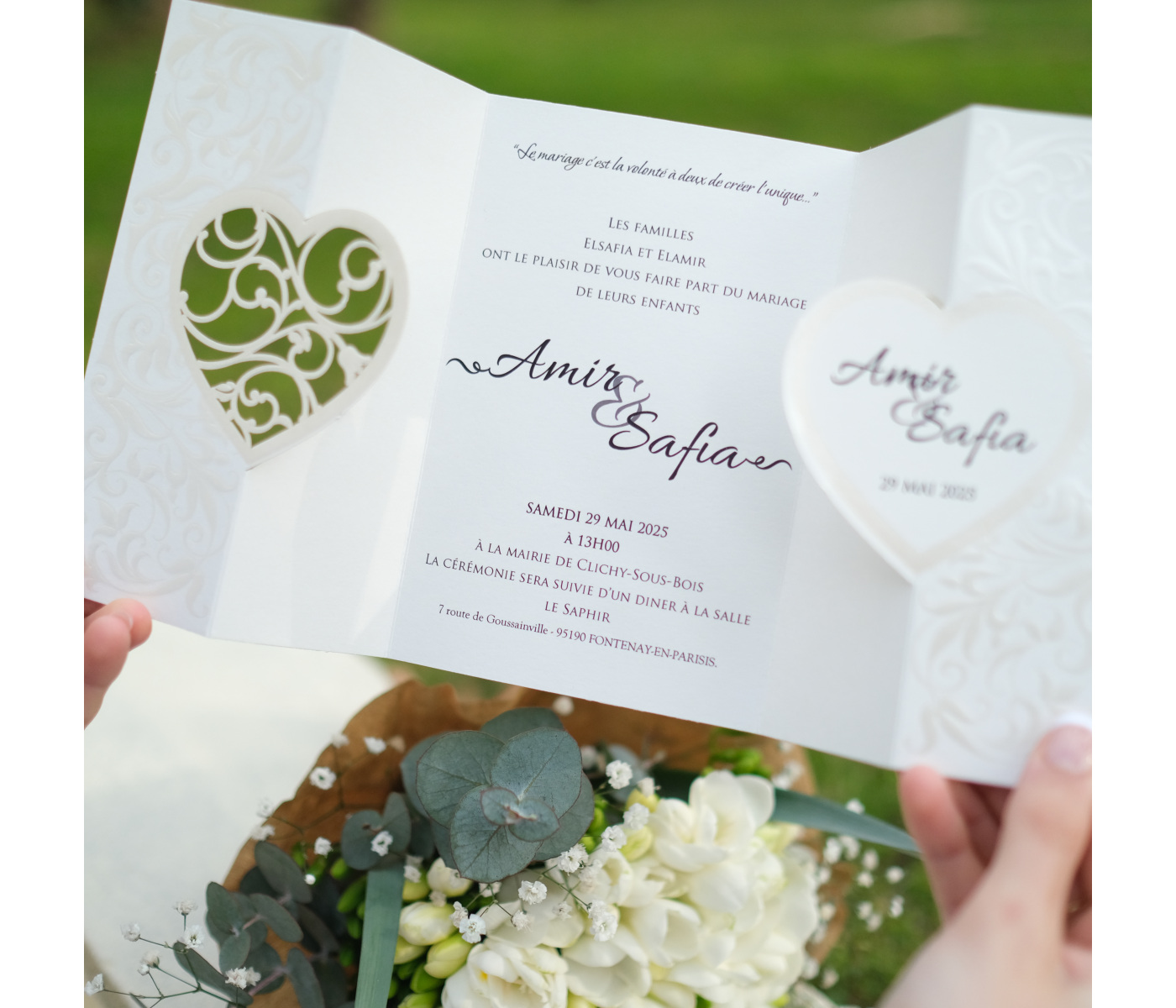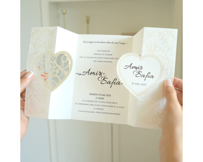 Carte d'invitation dépliable laissant apparaitre les prénoms des mariés sous un motif en coeur
