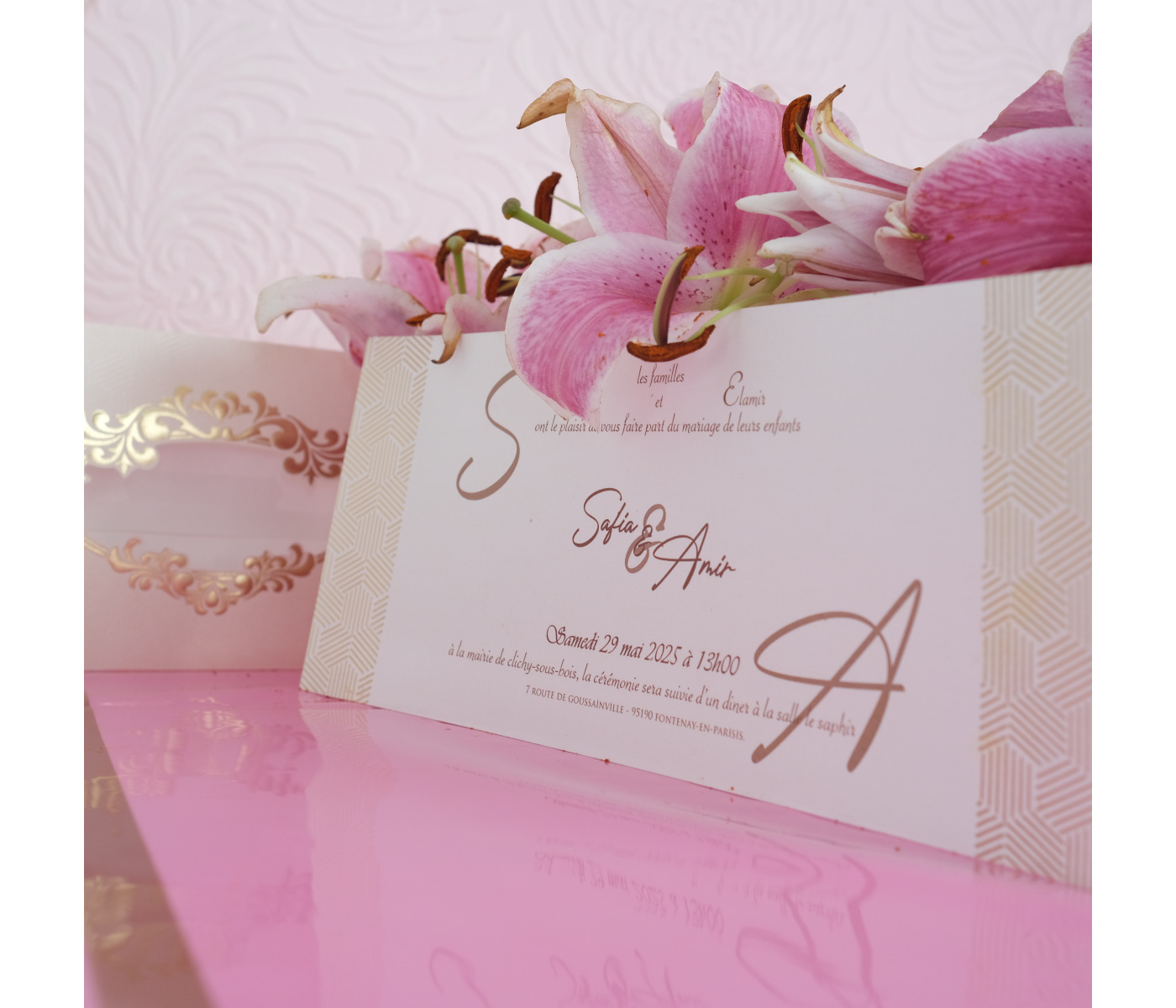Carte d'invitation se glissant dans une pochette laissant apparaitre les prénoms ou initiales des mariés au centre.